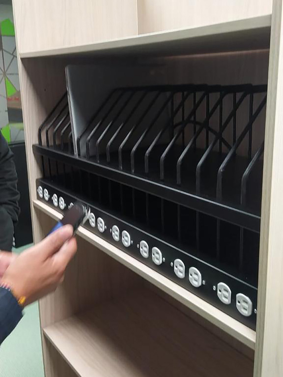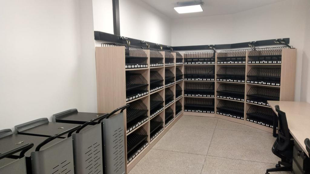 Estanterías para el almacenamiento y recarga eléctrica de laptops o tabletas, con el complemento de carros transportadores de estos de forma segura.